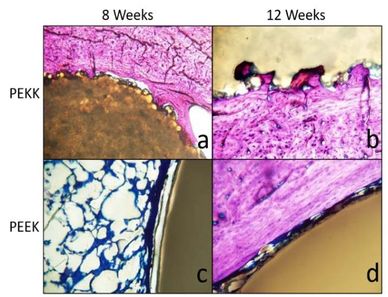 The in vivo bone response to OsteoVy™ PEKK compared to machined PEEK in a rabbit femoral model at 8 and 12 weeks demonstrated bone growing onto the surface of a PEKK rod implant and into the peaks and pits of the rough surface. However, fibrous tissue (blue) was noted surrounding a PEEK rod implant.